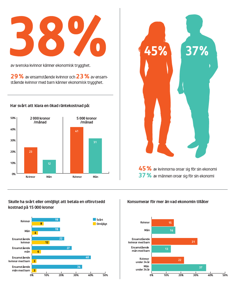 Under första kvartalet 2020 är det så många som var femte kvinna (18 %) som känner en ekonomisk otrygghet. Skillnaden är inte så stor mot män där motsvarande siffra är 16 procent. Samtidigt anser var fjärde kvinna (27 %) att de skulle ha svårt att klara en oförutsedd kostnad på 15 000 kronor. Av ensamstå ende kvinnor med hemmavarande barn är motsvarande siffra så hög som 44 procent. Det kan jämföras med 36 procent bland ensamstående män med hemmavarande barn.