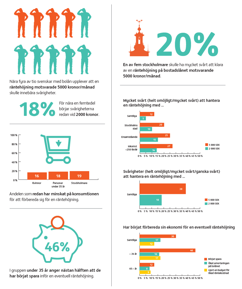 Stockholms stad utmärker sig som det område där känslig- heten för en räntehöjning är störst i hela Sverige. Där säger så många som en femtedel att det skulle ha mycket svårt att klara av en ökad räntekostnad för bolånet på 5 000 kronor.